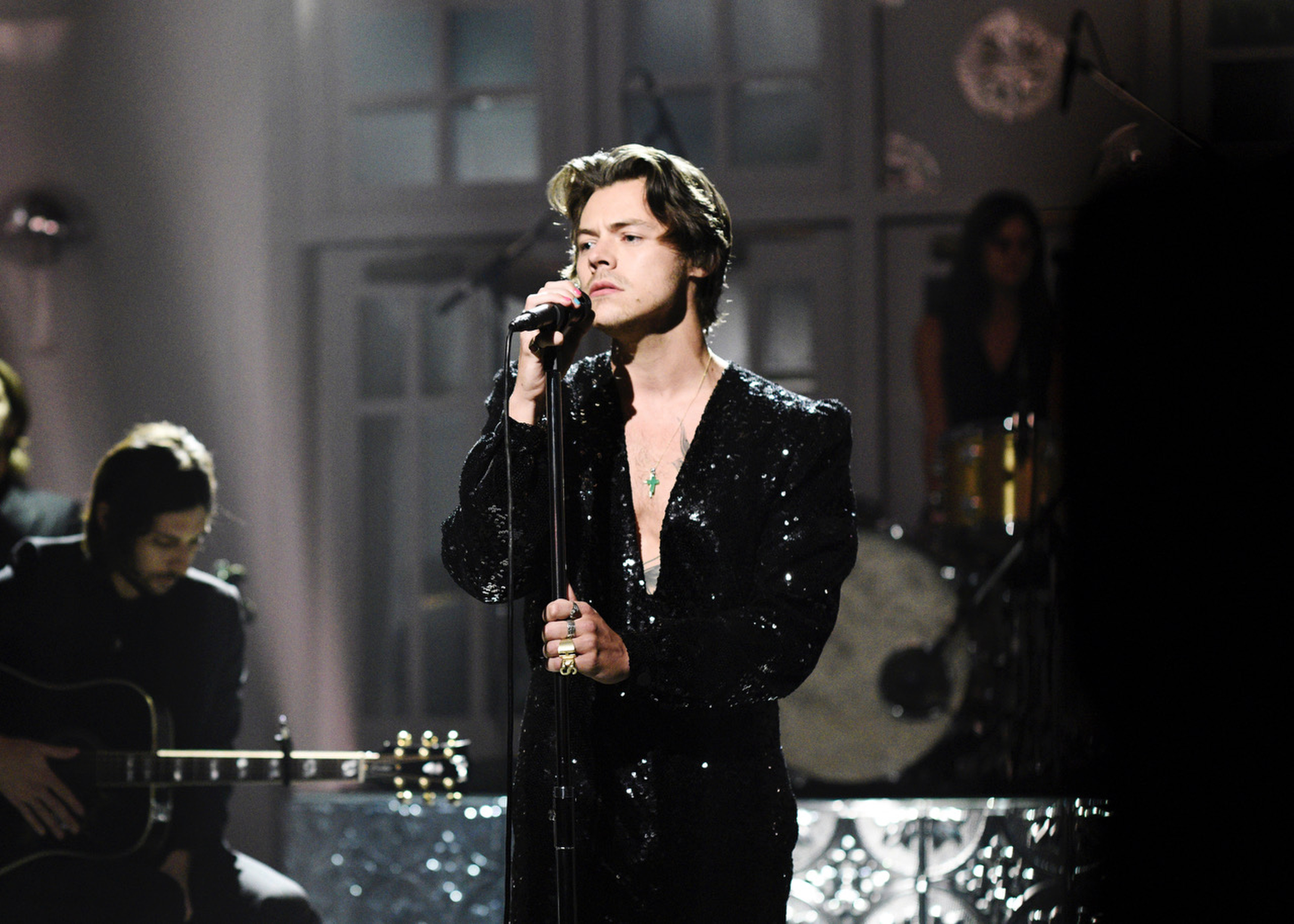 Membawakan “Lights Up”, pakaian Harry serasa disesuaikan dengan lagu, dilihat dari jumpsuit hitam GUCCI bertabur manik-manik di seluruh sisi, membuat cahaya berpantul dari pakaiannya. Pada pakaian kedua di acara ini, Harry lagi-lagi menunjukkan dadanya dengan potongan deep V. Padded shoulder? Flare-cut leg? With hints of tatoos? Saya bisa membayangkan Harry bertahan dengan style ini untuk waktu yang cukup lama.