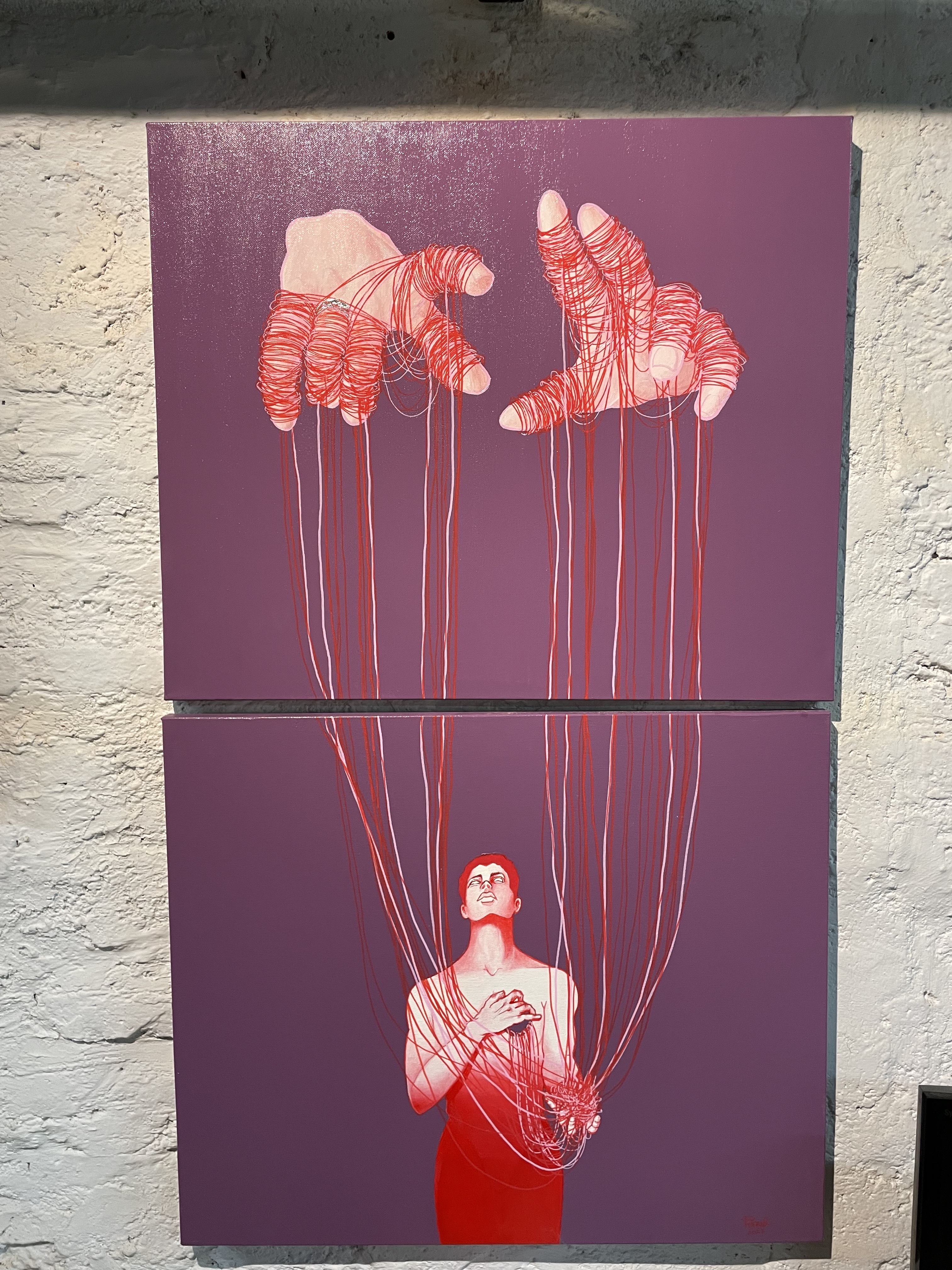 Empat lukisan mixed media diatas kanvas dengan fokus ribuan garis-garis tipis dalam setiap karyanya. Bagi saya yang awam akan pengetahuan seni, ribuan garis tersebut ibarat membatik diatas kanvas. Penuh ketelitian dan kestabilan emosi untuk menciptakan garis setipis benang tersebut.