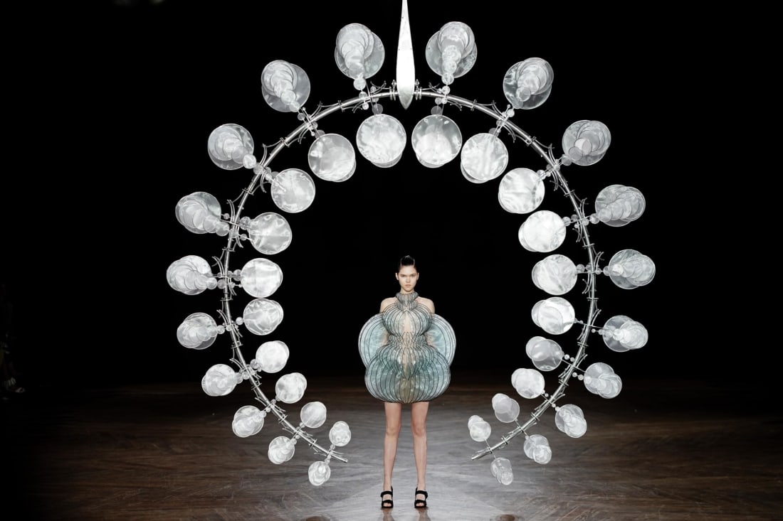 Iris Van Herpen menghadirkan 19 busana yang sebagian besar di antaranya dapat digerakkan oleh angin. Lalu yang lebih menariknya lagi menurut saya, ia juga menggunakan teknik Japanese floating ink yang bernama Suminagashi dalam pembuatan koleksi ini. Teknik yang menciptakan garis-garis sehingga tampak bergerak, seperti yang dapat dilihat pada koleksi ini.