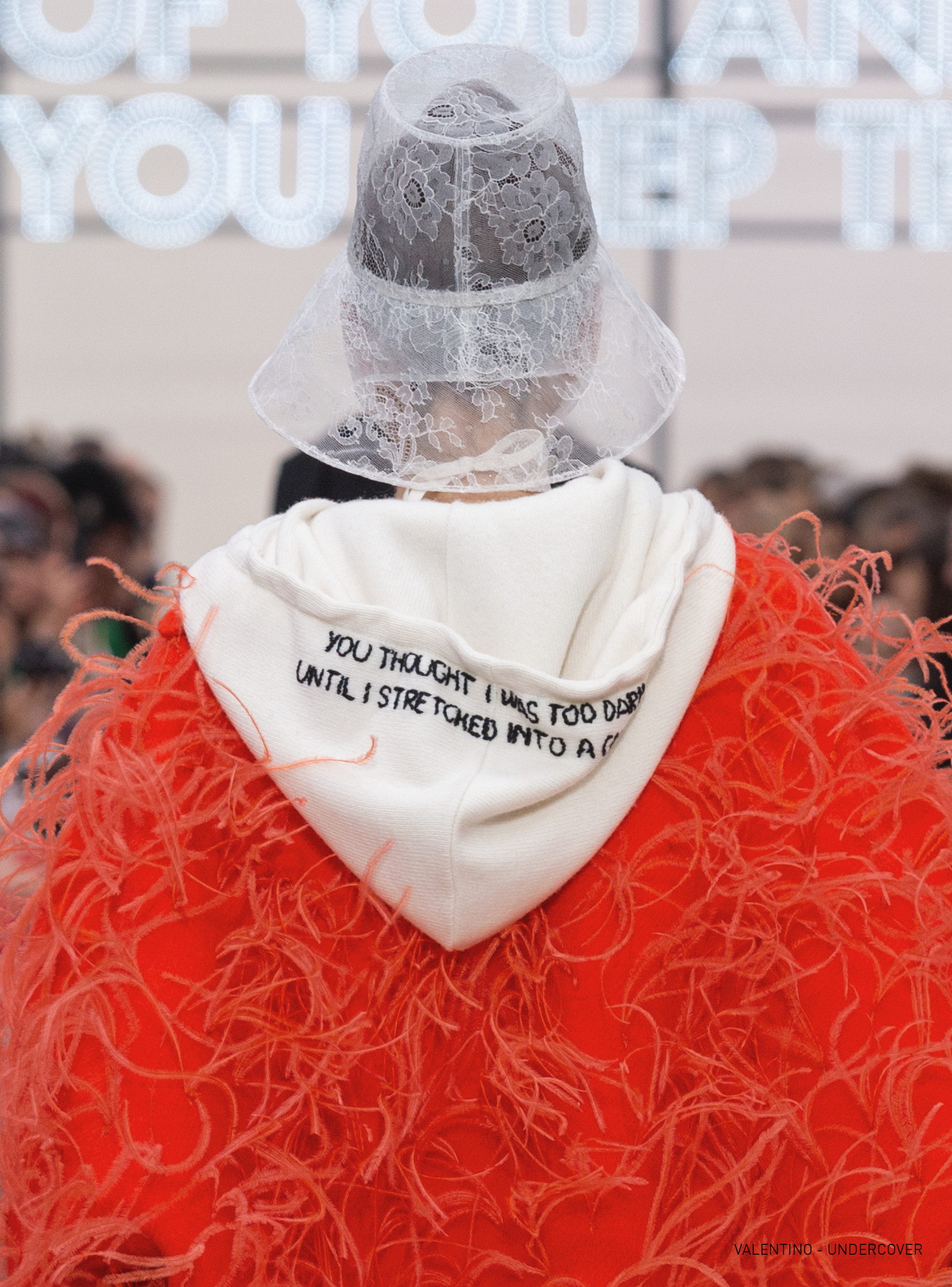 Apa jadinya ketika couture dan puisi saling menginspirasi? Berkolaborasi dengan penyair kontemporer Greta Bellamacina, Mustafa The Poet, Yrsa Daley-Ward, dan Robert Montgomery, Piccioli menghasilkan koleksi Valentino ON LOVE yang delicate dan magical. Karya kolase yang hampir tiap look ini dijadikan visual yang indah dari setiap kalimat puisi oleh Jun Takahashi dari Undercover.