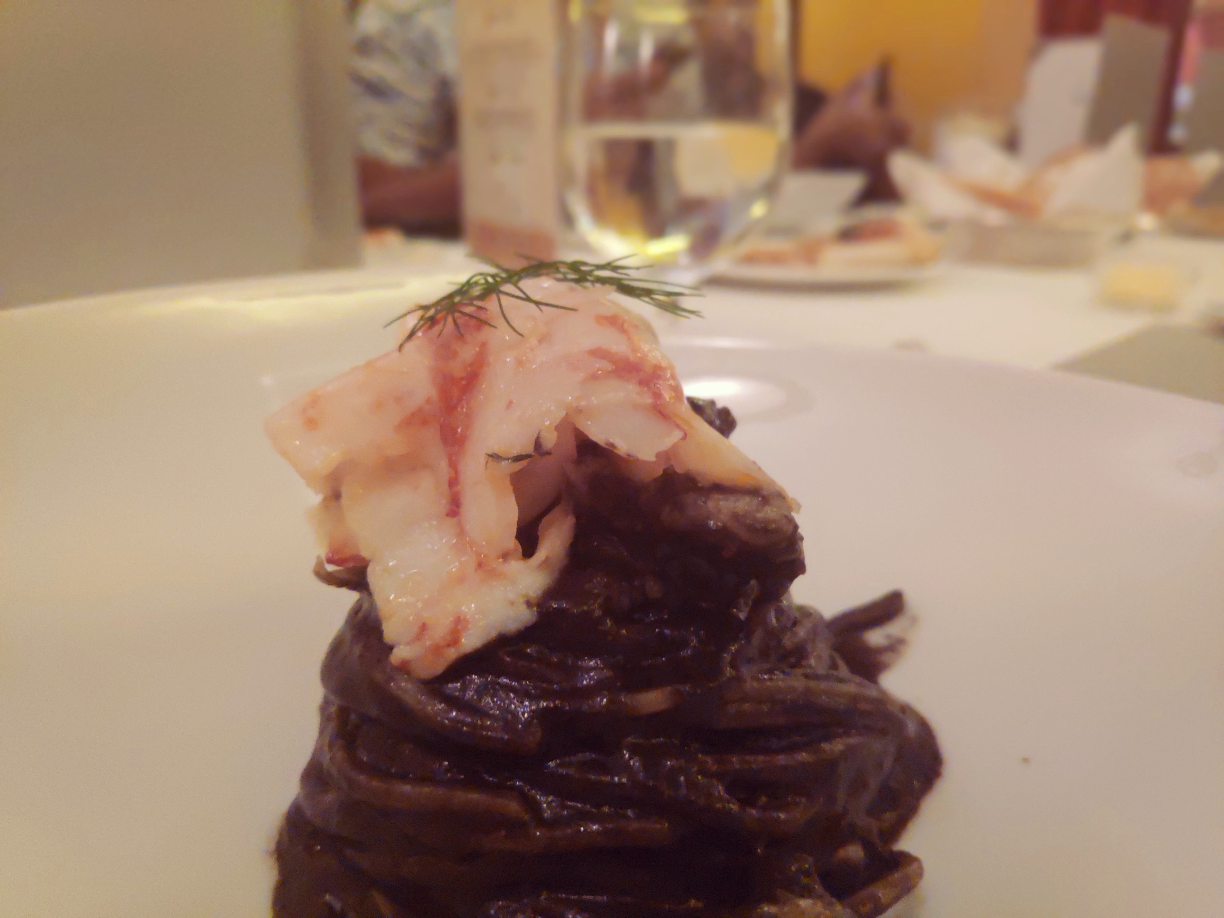 Tagliolini "alla chitarra", eggplant purée and prawns