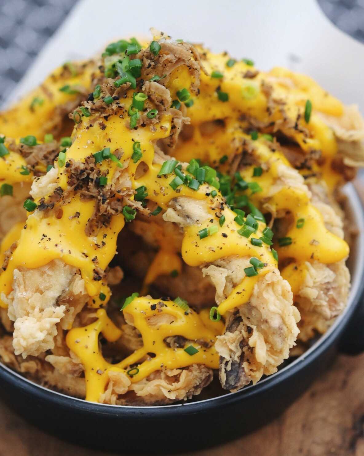 Hidangan pertama yang siap saya cicipi dalam perjamuan adalah Crispy Portobello Truffle & Cheese. Jujur, melihat bentuknya saja sudah cukup berhasil memberi saya bayangan akan betapa renyahnya hidangan tersebut. Sekali makan, nggak aka bisa berhenti, batin saya. Well, I took the risk, anyway. Dan benar saja, kerenyahan jamur goreng tepung berlumur keju, lengkap dengan aroma truffle memberi tantangan bagi saya untuk dapat berhenti mengunyah.