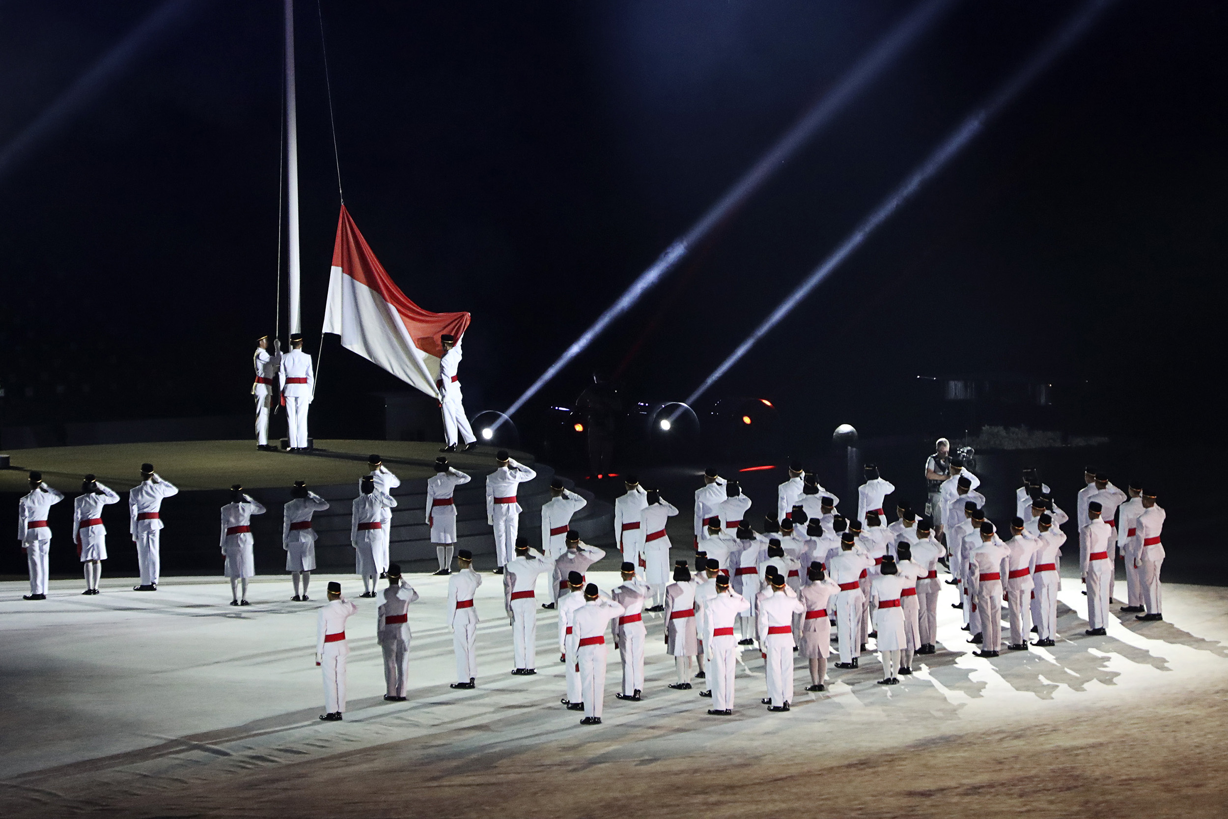 Pengibaran bendera Merah Putih saat pembukaan Asian Games ke-18 Tahun 2018 di Stadion Utama GBK, Senayan, Jakarta, Sabtu (18/8). (Foto: Dok. INASGOC)