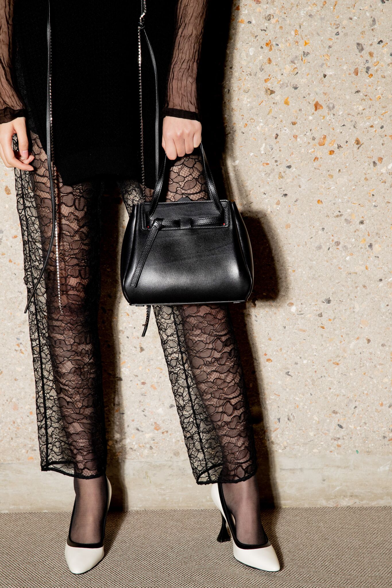 Model tas yang cukup simple ini menampilkan emblem Gate knot yang menjadi ciri khas brand LOEWE. Bahan utama dari tas Lazo mini menggunakan bahan boxcalf leather dan snakeskin yang sangat high-end. Lalu untuk menambah kesan yang mewah, interior dari tas Lazo Mini ini dilapisi dengan soft Nappa leather berwarna hitam. Namun, untuk tas Lazo Mini yang berwarna hitam, lapisan leather tersebut dibuat dengan warna merah untuk memberikan efek yang lebih chic dan mencolok.