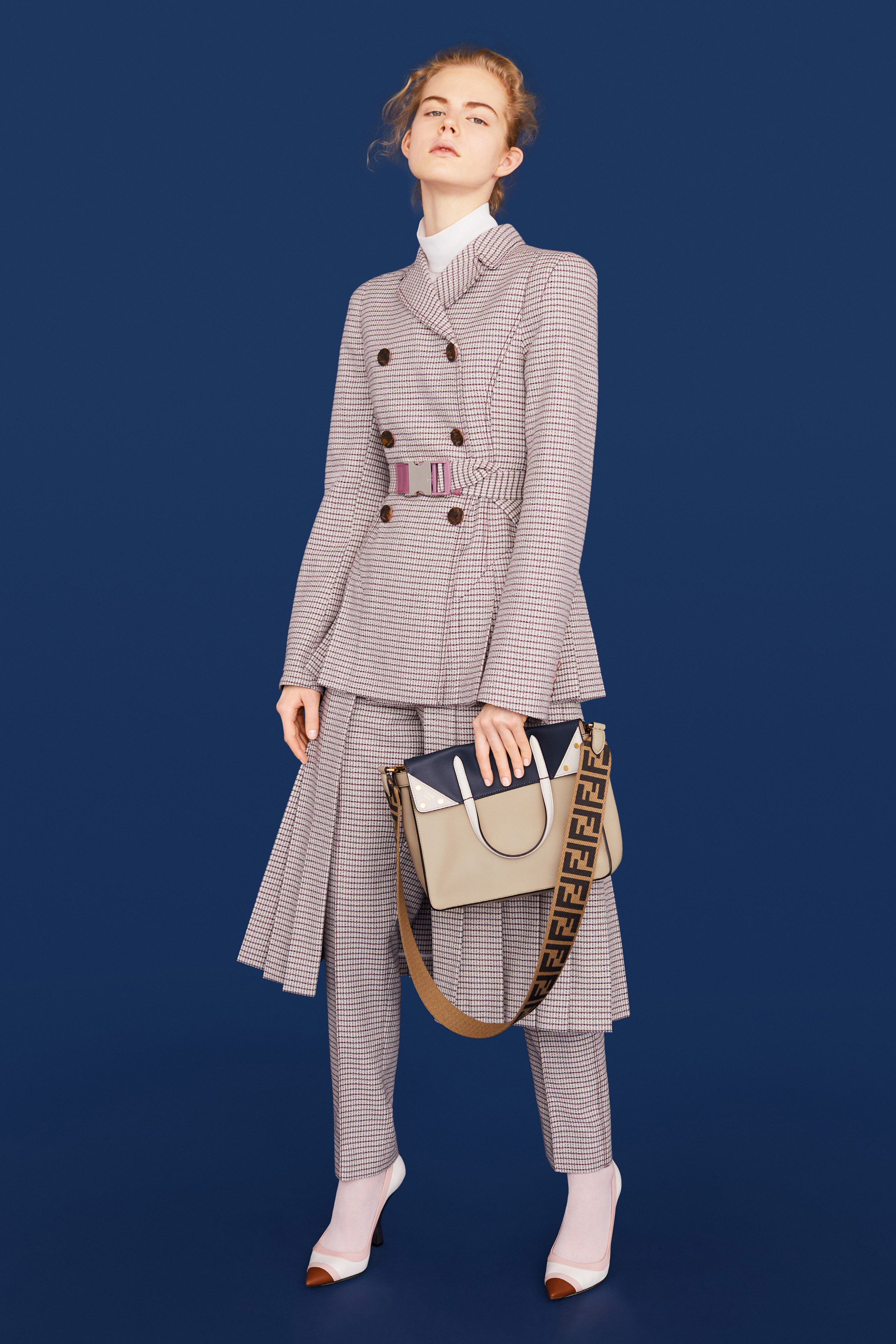 Selain rok lipit yang dipasangkan dengan blazer double-brested ala seragam serdadu, dengan motif bunga menonjol dan gesper logam seakan menyiratkan penggabungan kedua style yang feminin dan sporty. Warna-warna yang sangat menonjol sekaligus kalem membuat siapapun terlihat cerah di dalamnya. I mean, look at both the bold orange and mint color on the iconic FF logo! Tidak hanya itu, sepatu jelly shoes yang pernah menjadi sepatu kesayangan Anda kini disulap menjadi sandal color-blocked dengan sol tinggi yang menarik.
