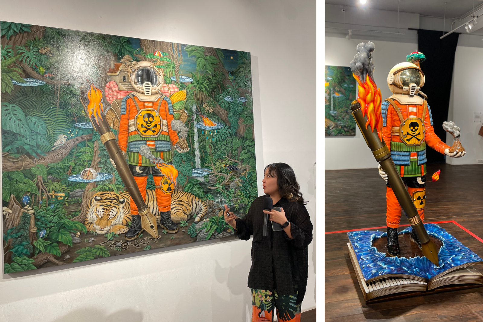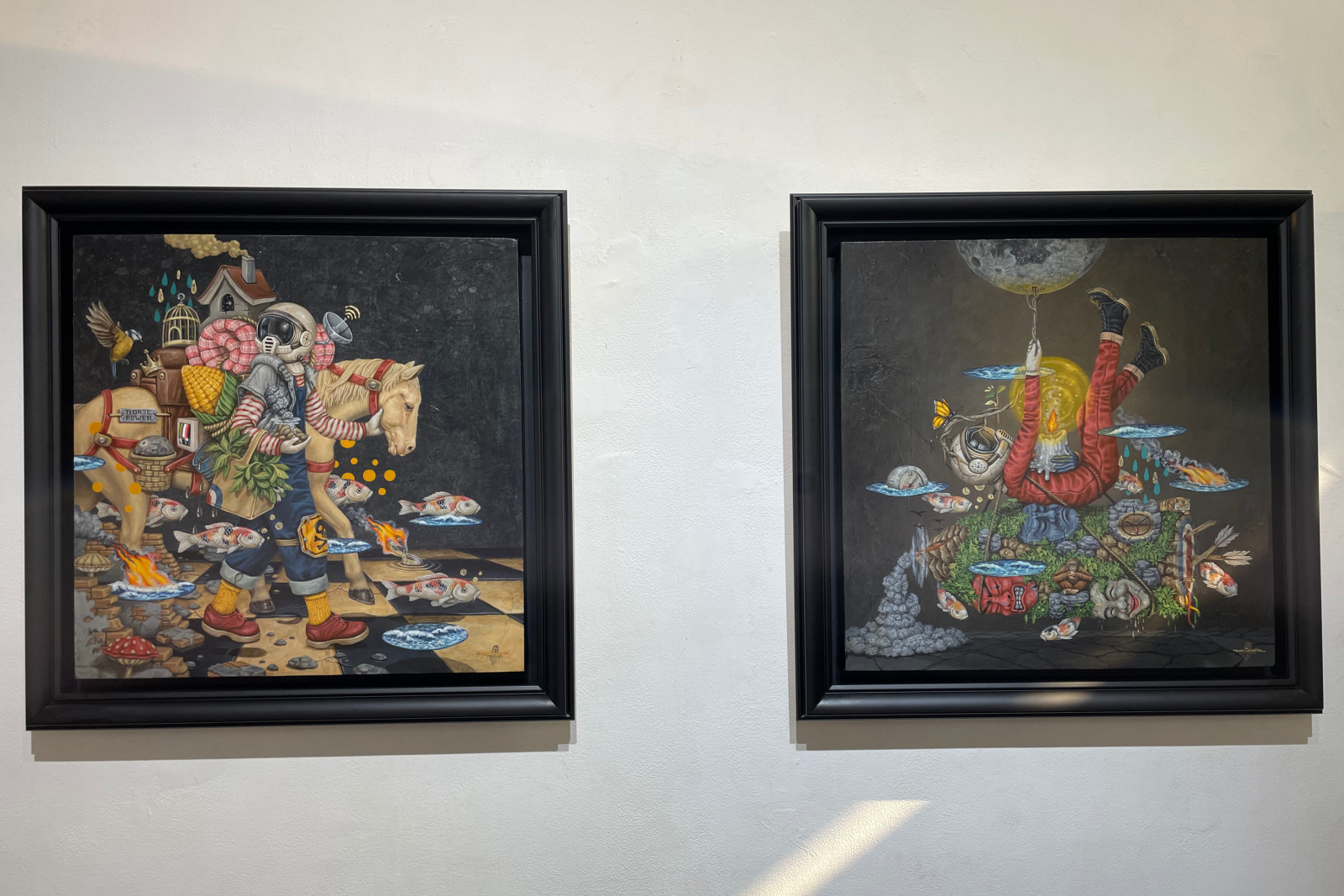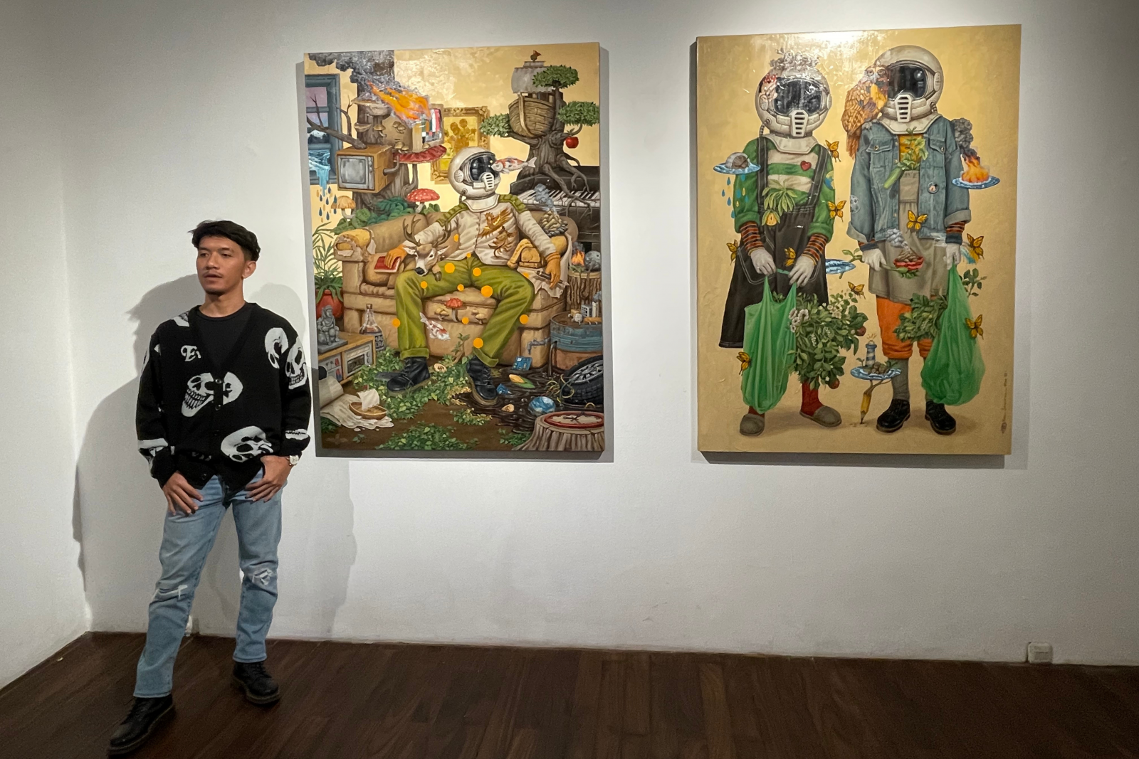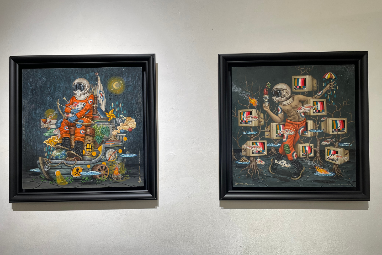 Pada saat memasuki ruang pameran, pengunjung akan disambut oleh lukisan Iwan yang menggambarkan tokoh utamanya, yakni manusia dengan helm luar angkasa, menggandeng kuda, hingga ada yang jatuh dari dunia sambil menggendong gunung. Mungkin dari awal masuk ini, pengunjung akan langsung berpikir apa maksudnya? Iwan ingin menggambarkan tentang efek kemajuan teknologi dengan limbah yang diciptakan. Menurut saya, ini sangat realistis dengan apa yang terjadi sekarang.
