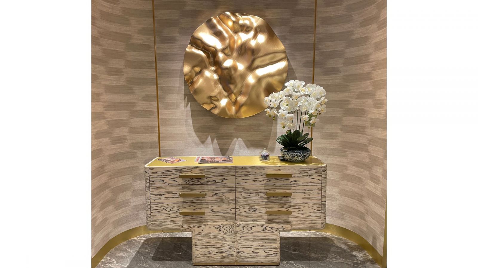 Uniknya, LOFTS tidak hanya menyediakan jasa pembuatan furniture, tapi hingga pembuatan art piece. Salah satunya adalah lempengan berwarna gold ini.