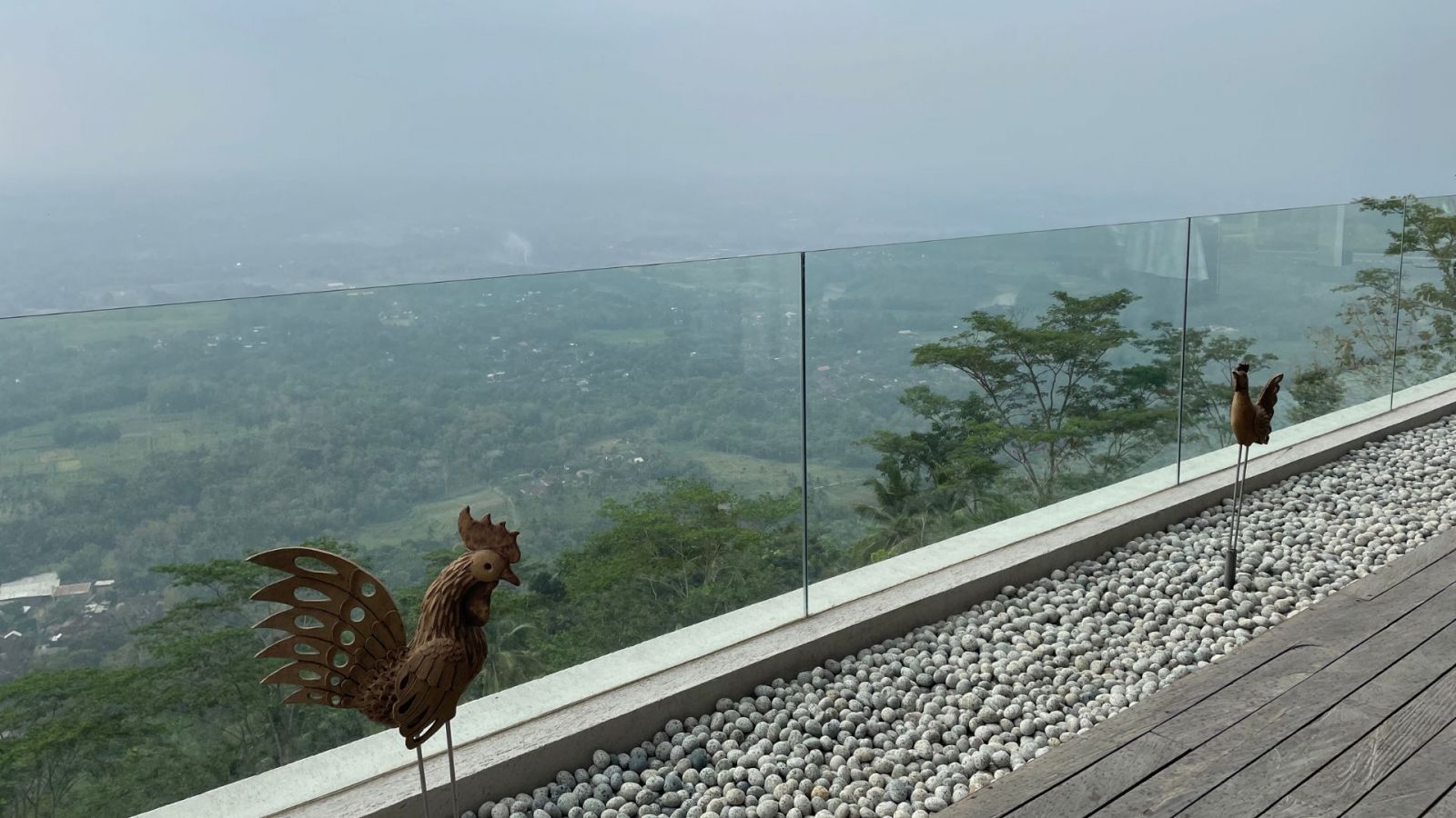 Dengan mengedepankan konsep Infinite Horizon Experience, lokasinya yang berada di tepi tebing, dari Langit Khatulistiwa saya dapat menikmati panorama alam tak terbatas dari Sungai Progo dan enam gunung; Merapi, Merbabu, Andong, Telomoyo, Tidar, dan Sumbing. Dengan catatan, kondisi alam bagus. Untungnya, sesampainya di sana, saya masih bisa melihat pemandangan kota Magelang. Tapi sayang, karena sudah mulai mendung, kabut sudah menutupi deretan gunung.