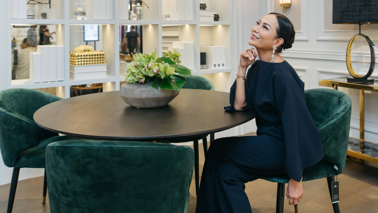 Ada juga sentuhan hijau emerald dan biru yang Agam berikan sebagai sentuhan nuansa segar dari keseluruhan ruang showroom. Menurutnya, aksesoris dan warna khusus menjadi salah satu ekspresi khas koleksi Eichholtz, seperti warna perak dan gold, chandelier dan wall lamp. Dengan demikian, kemewahan semakin bergelora.