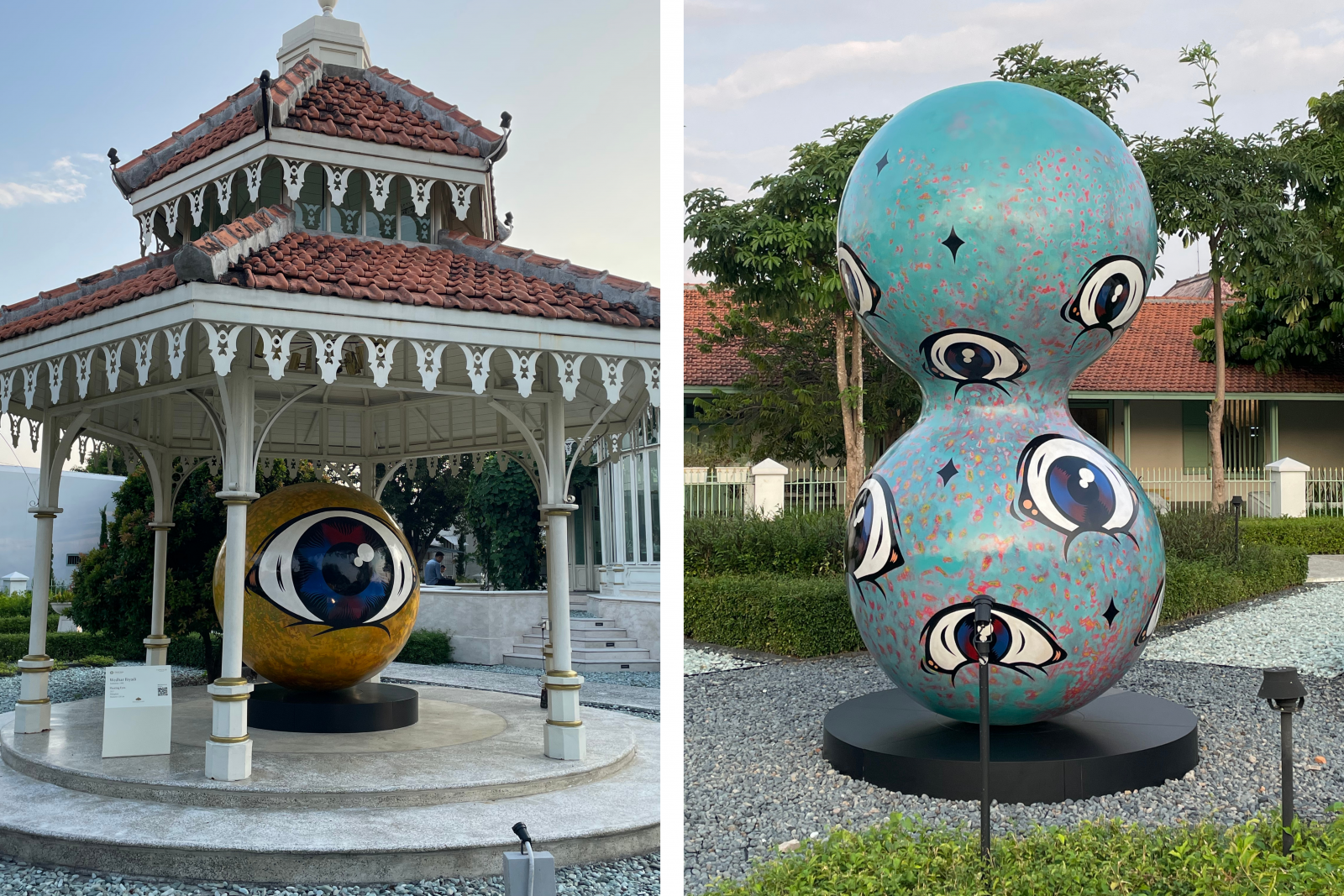 Dari area luar saja saya rasanya sudah ingin foto-foto. Pintu dan jendela jadul, atap besar khas Jawa, balai besar berisikan alat musik gamelan, hingga lantai atau ubin yang dingin saat diinjak, sangat langka saya temukan di Jakarta. Tepat pukul 17.00 WIB, kami semua diperkenankan memasuki taman Pracima Mangkunegaran. Saat memasuki gerbang Pracima, saya dibuat semakin terpanah dengan indahnya bangunan, taman yang luas, air mancur yang cantik, dipadukan dengan langit senja yang cerah mendukung acara pembukaan SURAKUSUMA. Terlebih lagi, sampai 29 Juli 2024, taman ini dihiasi dengan karya patung dari seniman Indonesia dan mancanegara.