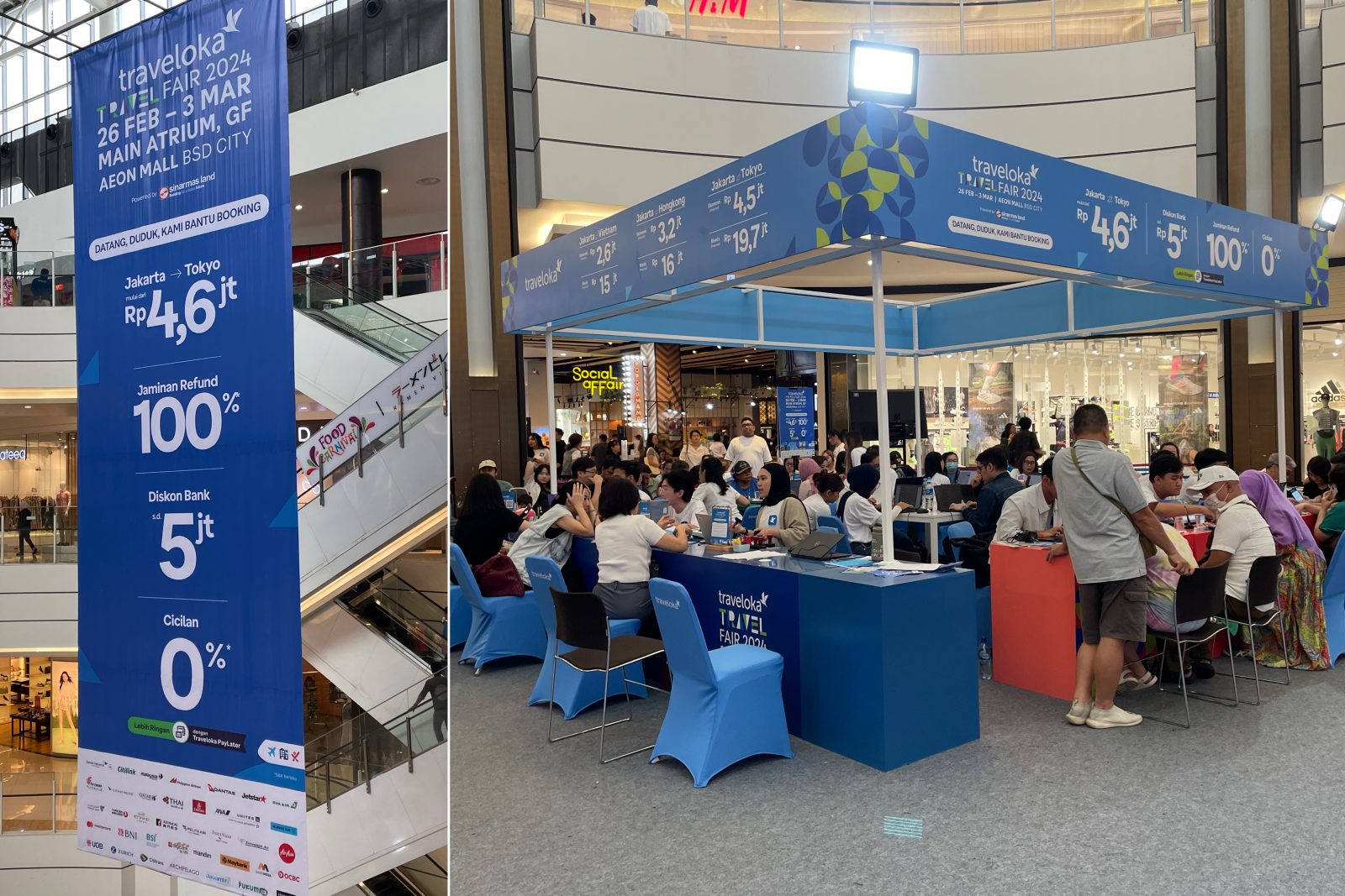 Sesampainya di Main Atrium AEON Mall BSD, Anda akan diarahkan untuk duduk di antrian dan bersiaplah karena travel guide akan mengarahkan Anda dan memberikan segudang promo produk wisata domestik dan internasional. Ada tiket bus, kereta, pesawat, sewa mobil, antar jemput bandara, akomodasi, hingga fitur perlindungan visa dan asuransi perjalanan. Semua ini bisa Anda dapatkan di gelaran dan aplikasi traveloka.